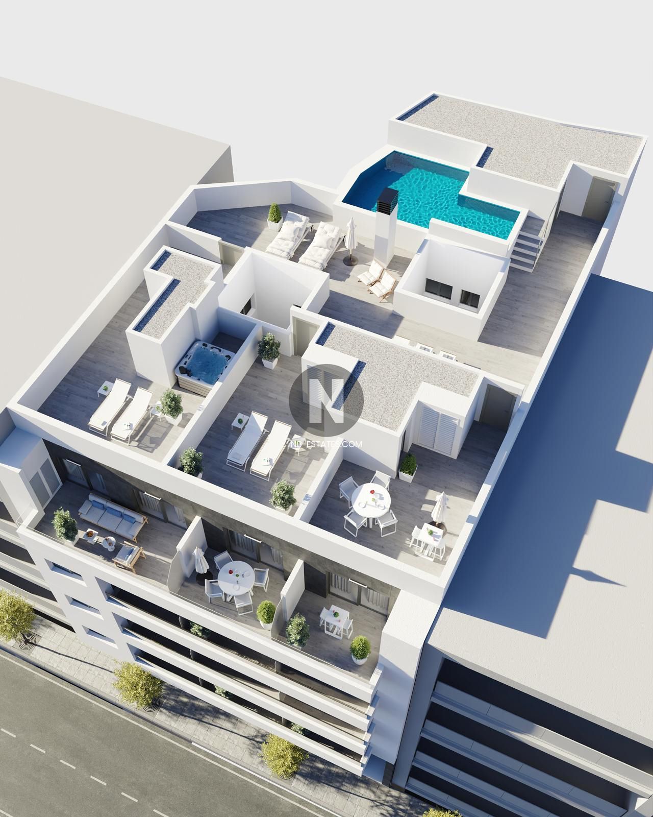 Dieses Neubauprojekt umfasst ein kleines Wohngebäude mit modernen Apartments im Zentrum von Torrevieja, etwa 150 Meter vom Playa del Cura entfernt.