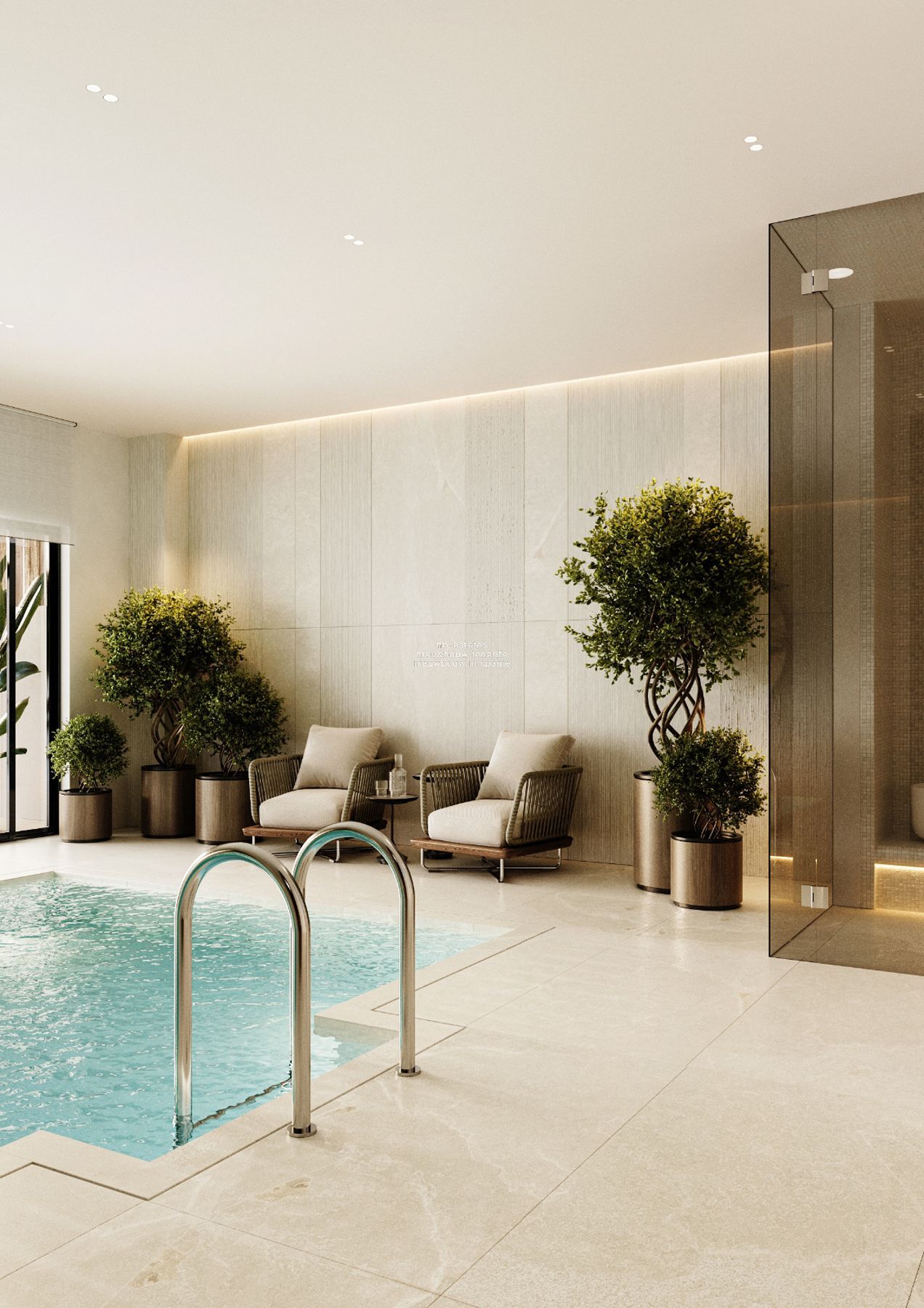 The homes are positioned to maximise natural light and views. Large windows and open layouts enhance the sense of space. Residents benefit from a wide range of shared amenities, including indoor and outdoor swimming pools, a wellness area with spa and sauna, a gym, co-working spaces and landscaped gardens with walking paths.