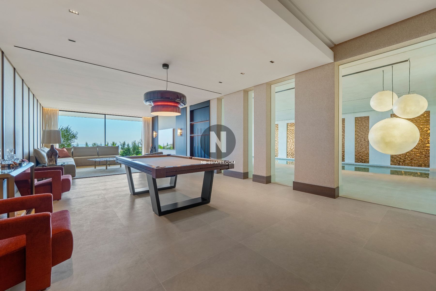 The villa is defined by its floor-to-ceiling windows, maximizing natural light and enhancing the connection between indoor and outdoor spaces. Expansive terraces and the swimming pool seamlessly extend the living areas. The use of high-quality materials and the inclusion of leisure facilities create a refined yet comfortable living environment.