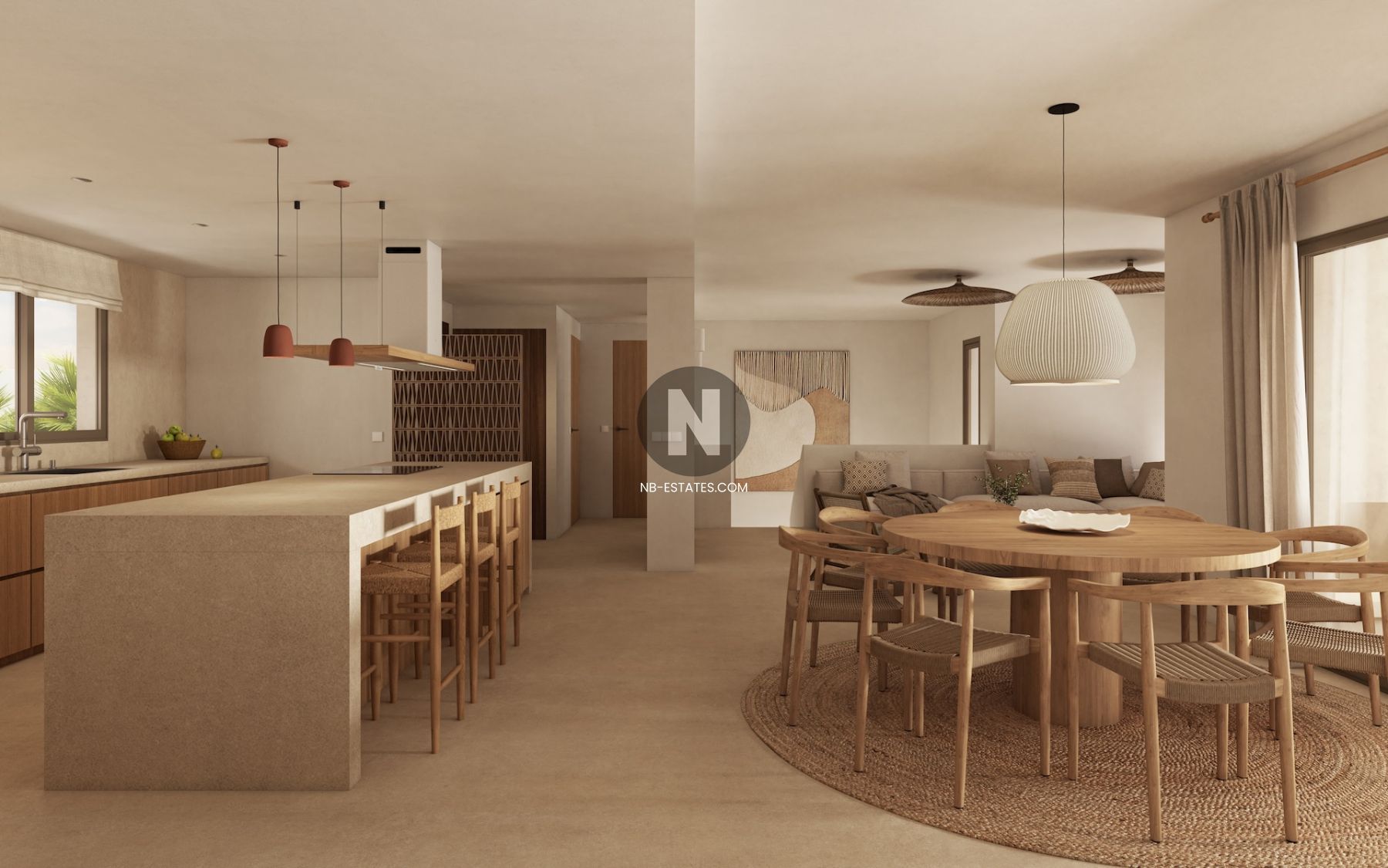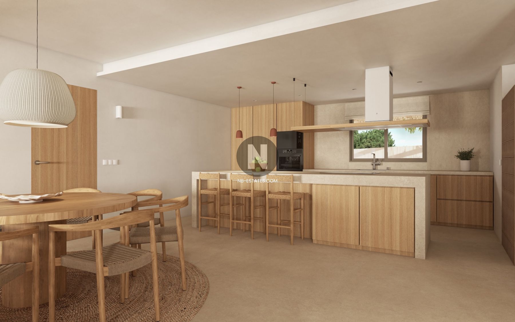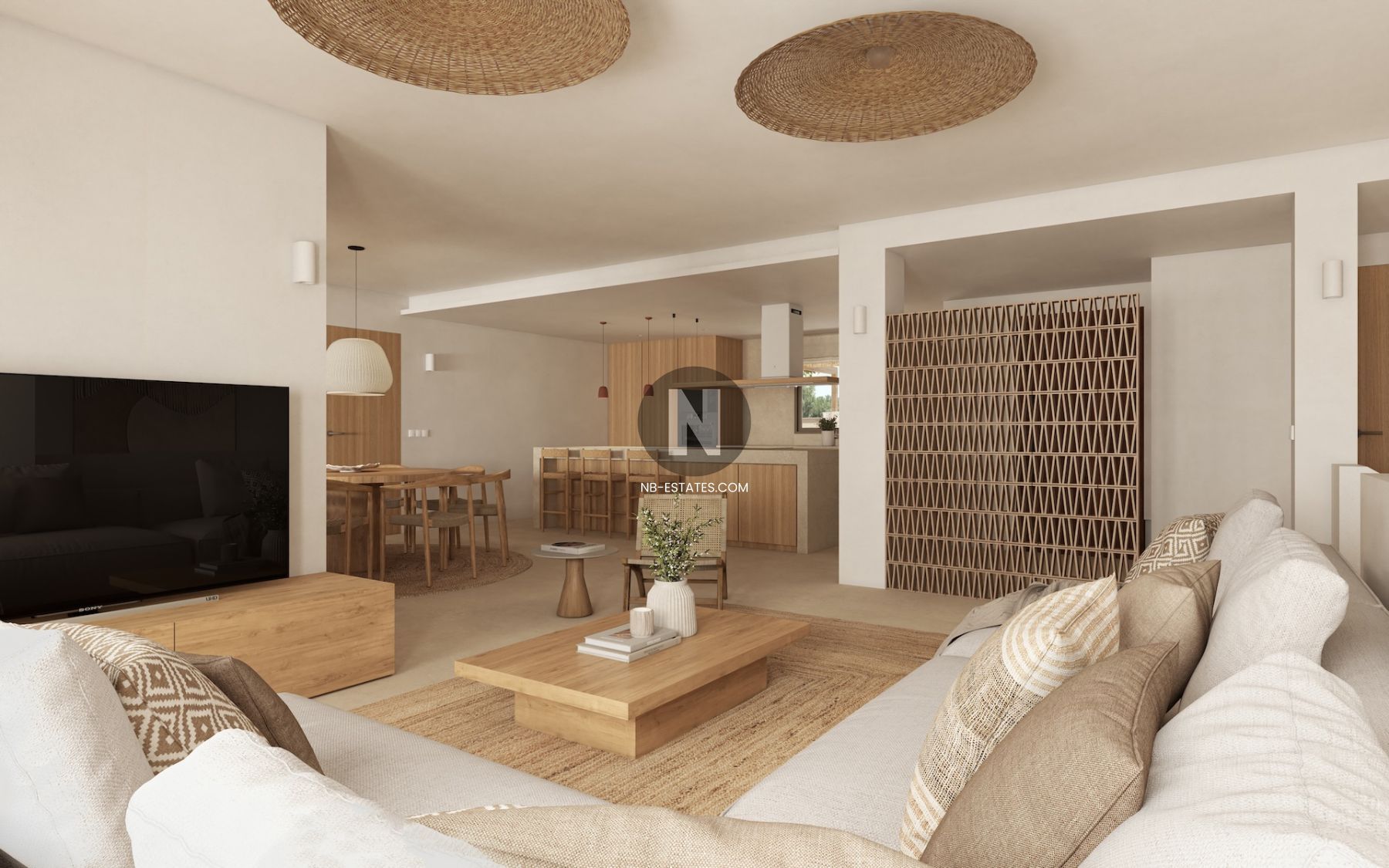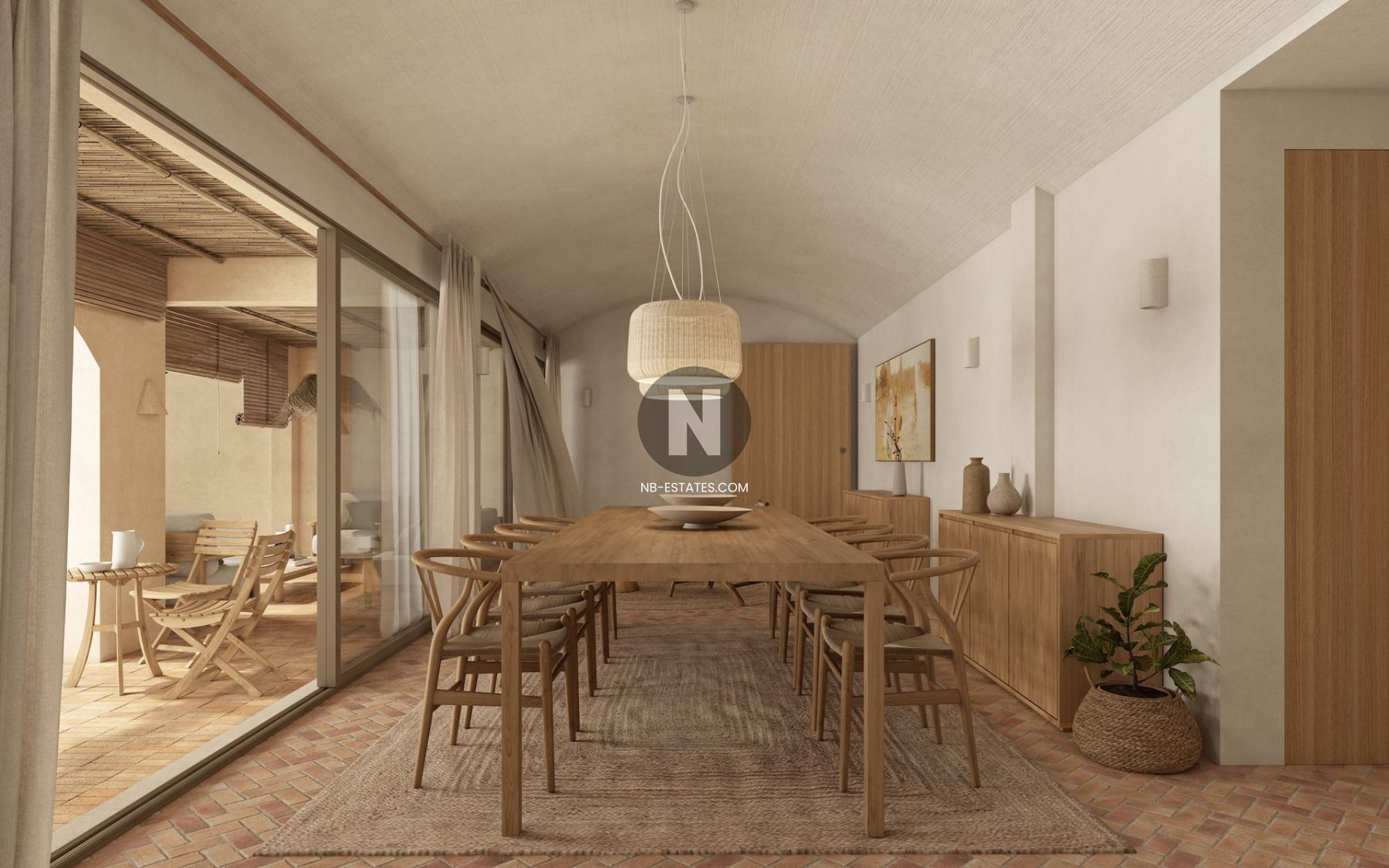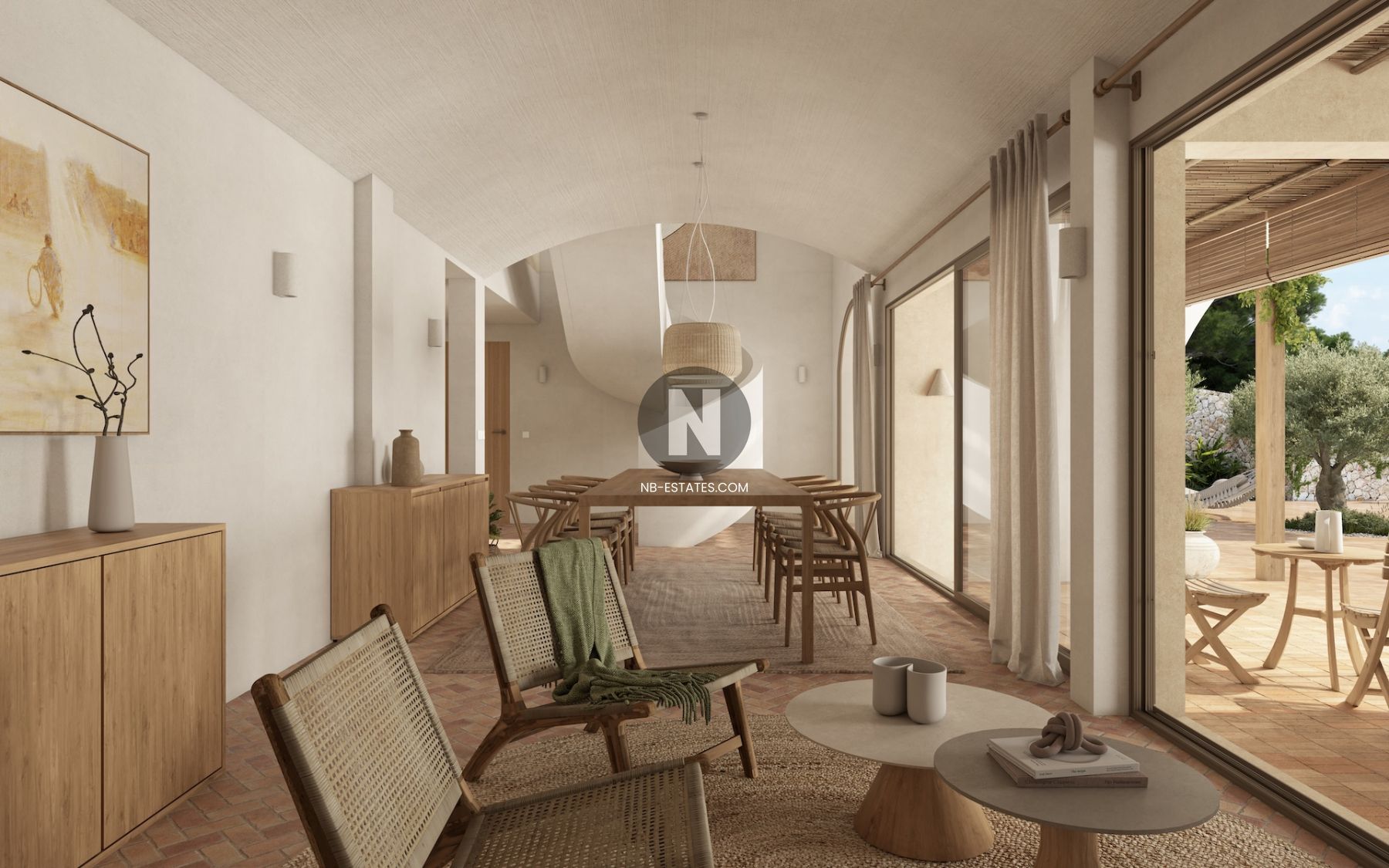 El diseño de la vivienda enfatiza una transición fluida entre el interior y el exterior. El acabado de los suelos de microcemento en el interior continúa con pavimentos de barro natural en las terrazas, creando un efecto de amplitud. El espacio exterior cuenta con una zona de barbacoa y pérgolas con cubierta de cañizo, ideales para el descanso a la sombra. Grandes ventanales correderos con rotura de puente térmico aseguran la máxima luminosidad y ofrecen acceso directo al jardín y a la piscina.