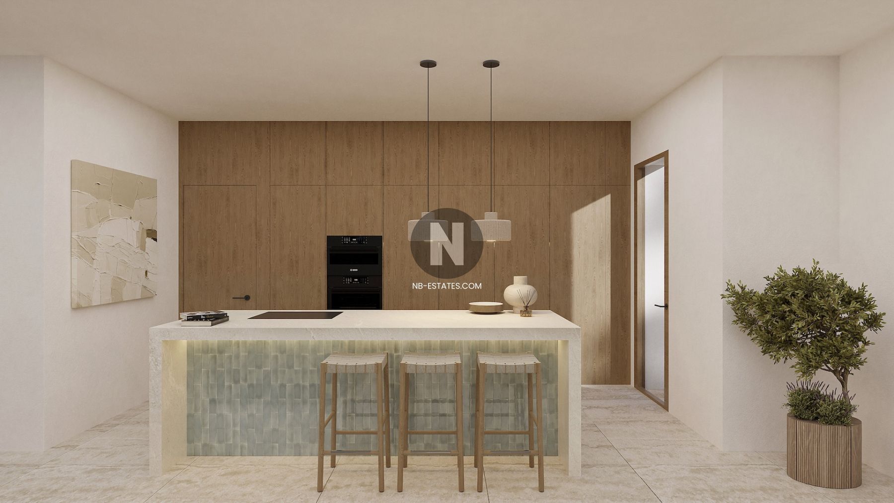 - Una cocina totalmente equipada con electrodomésticos Bosch integrados y una isla central.