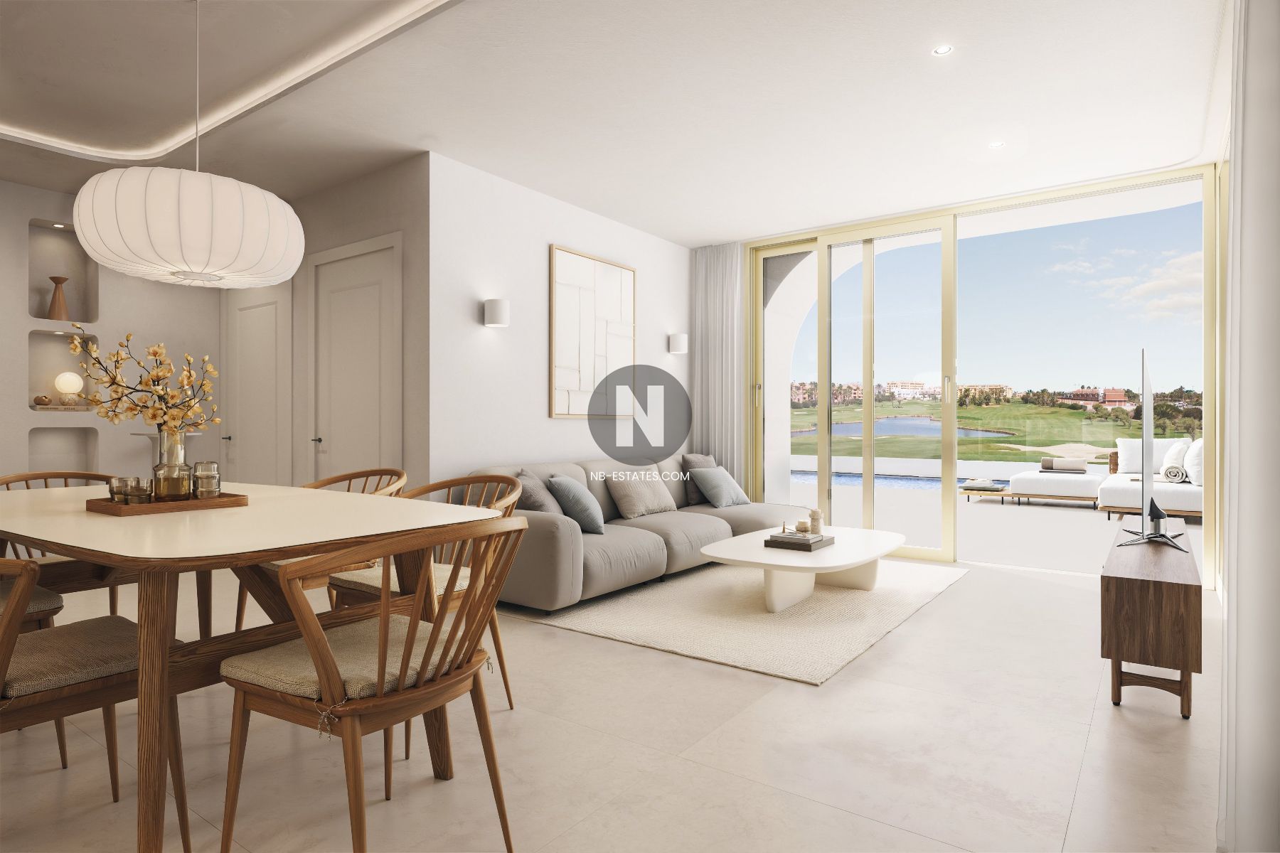 El diseño de las villas se centra en aprovechar al máximo la vida exterior. Grandes ventanales conectan el interior con el jardín y la piscina, mientras que el solárium ofrece un espacio adicional con vistas abiertas. Las parcelas están diseñadas para ofrecer privacidad sin aislarse del entorno natural y del campo de golf.