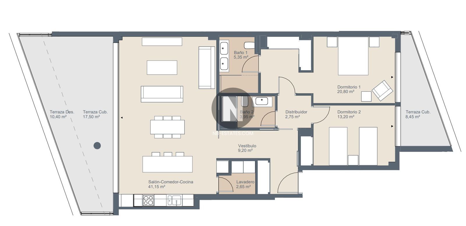 Dit penthouse heeft als troef dat het een mooie breedte heeft. Zo is de leefruimte maar liefst 41,15 m² groot, met een gevelbreedte van ± 8 m en directe toegang tot het voorste terras van 28 m². Achteraan biedt het twee slaapkamers waarvan één ensuite en een gastenbadkamer. De slaapkamers hebben directe toegang tot het achterste terras van 8,45 m².