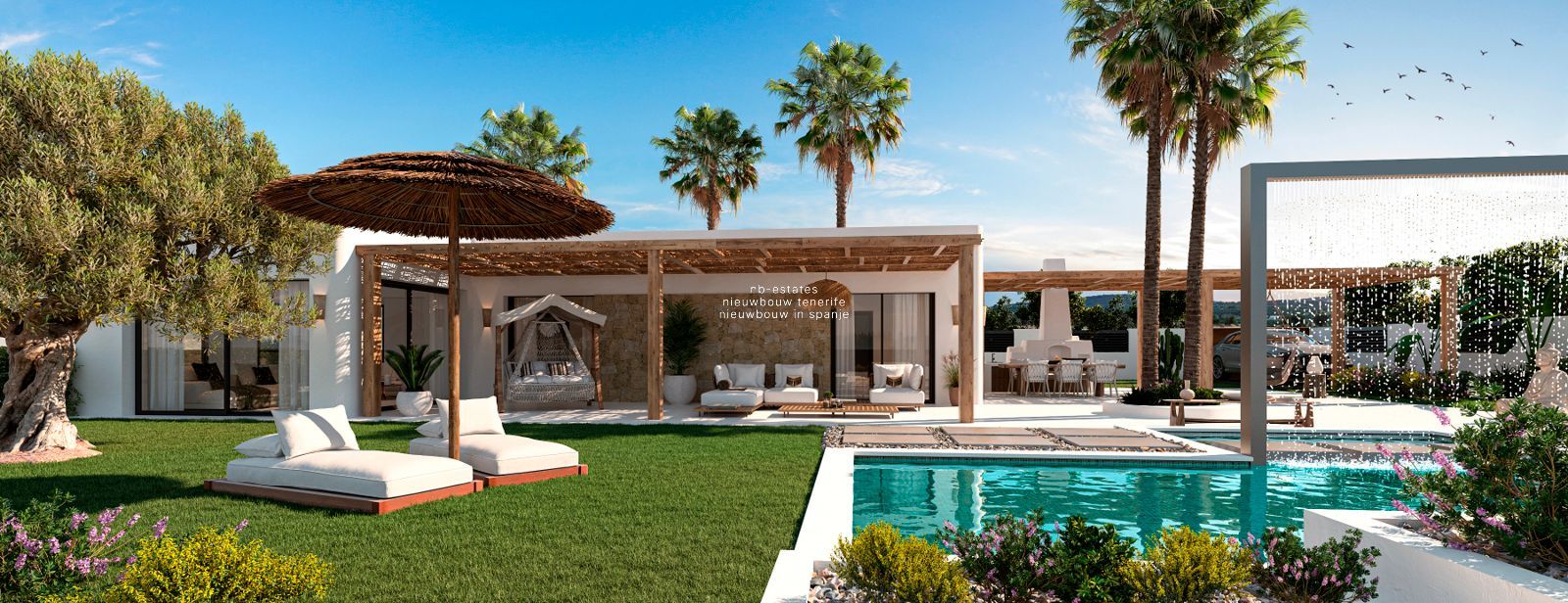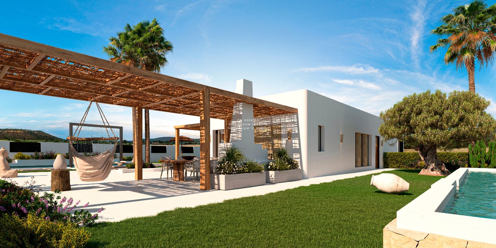 De villa is ontworpen met oog voor detail en harmonie. Binnen en buiten vloeien naadloos in elkaar over dankzij het open ontwerp en de grote ramen. De combinatie van porseleinen vloeren, lichte tinten en natuurlijke materialen creëert een tijdloze, warme sfeer. De badkamers zijn voorzien van regendouches en sanitair van topkwaliteit. Buiten nodigt het ruime terras met zwembad uit tot ontspannen, omringd door een fraai aangelegde tuin met mediterrane beplanting en automatische irrigatie.