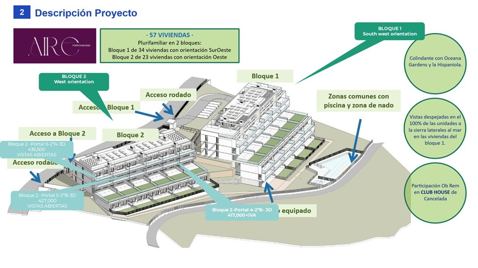 Aire biedt een moderne levensstijl met uitgebreide gemeenschappelijke faciliteiten: een zwembad, aangelegde tuinen, een fitnessruimte binnen en buiten, en directe aansluiting op het fietspad van Cancelada. Daarnaast hebben bewoners exclusieve toegang tot het nabijgelegen Club House met spa, sauna, fitness, restaurant en een terras met zeezicht.